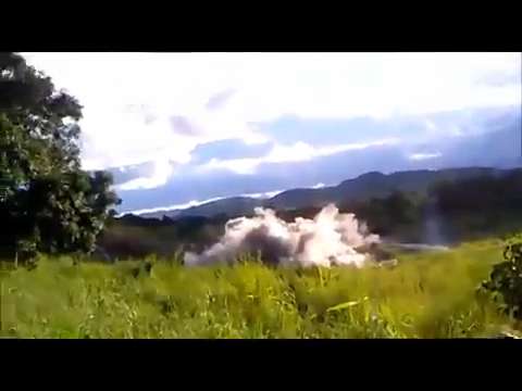 Filmed at around 180m, 3.6 tons of emulsion mix placed into multiple positions in granite, explosion on mountain pass N
