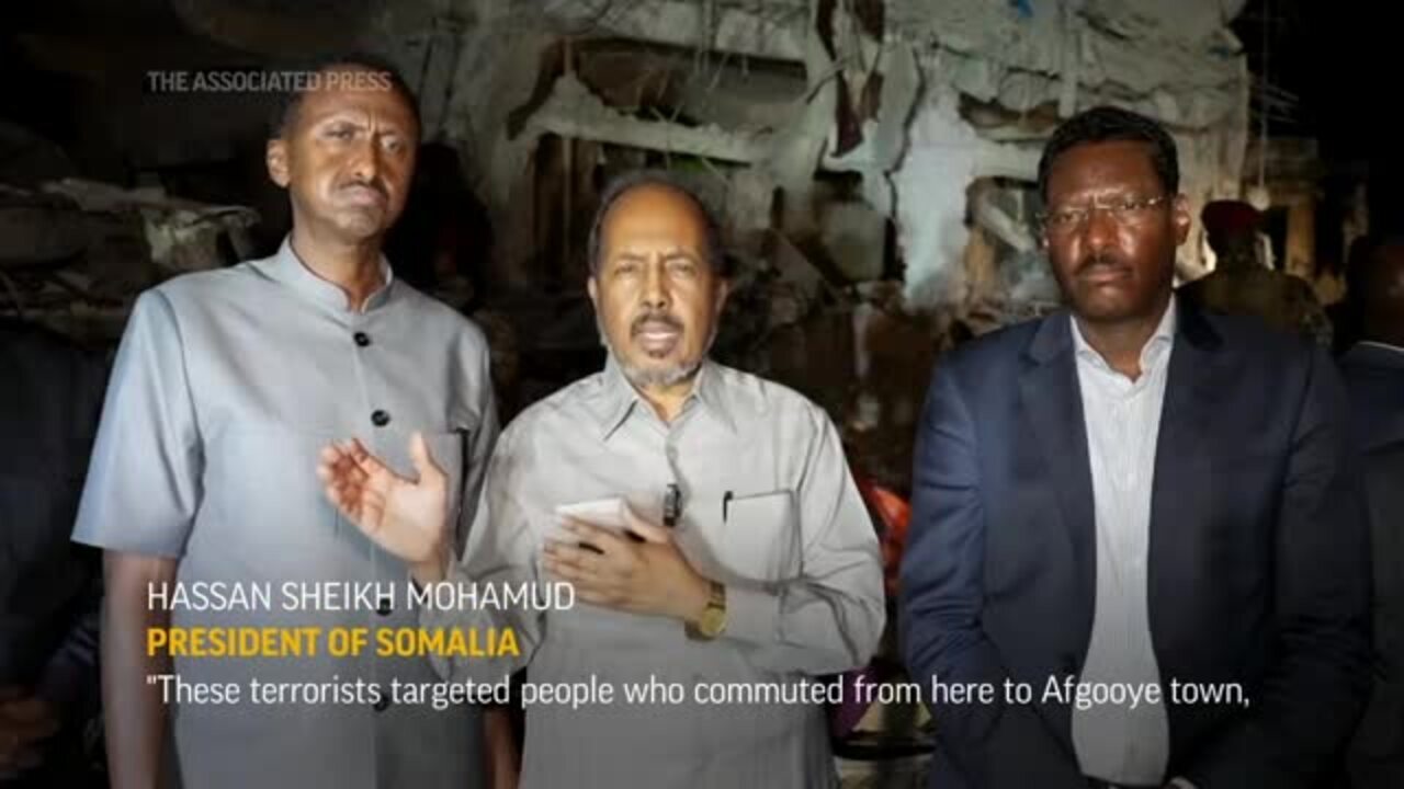 Somalia's president said at least 100 people were killed in Saturday's two car bombings at a busy junction in the